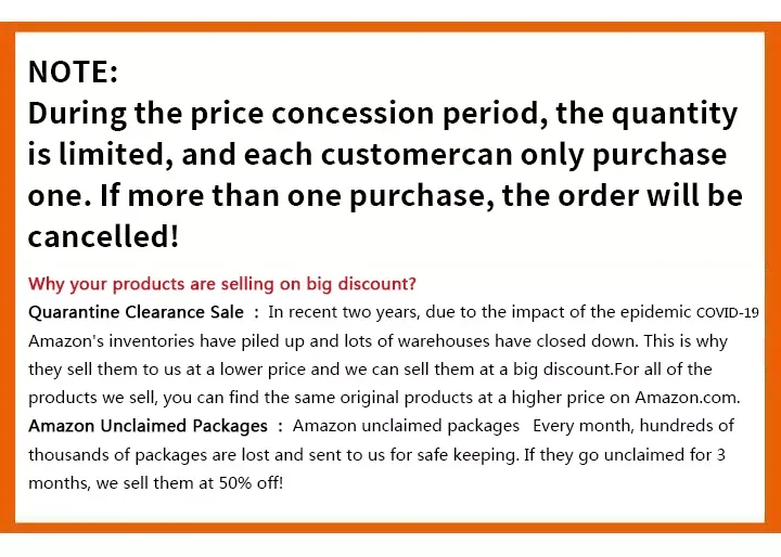 ??Why Are Your Products So Discounted? Full Liquidation: In The Past Two Years, Due To The Impact of The COVID-19 Epidemic, Amazon Has Overstocked and A Large Number Of Warehouses Have Been Closed. This Is Why They Are Sold To Us At A Lower Price, and We Can Sell Them At A Great Discount.